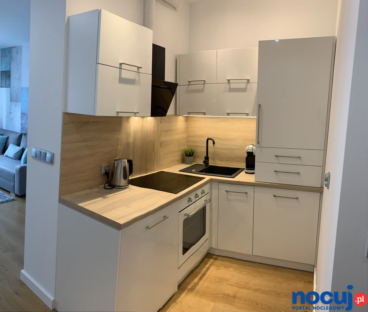 • Kuchnia – płyta indukcyjna, piekarnik, lodówka, zmywarka, czajnik, ekspres do kawy, naczynia, toster, pralka w zabudowie