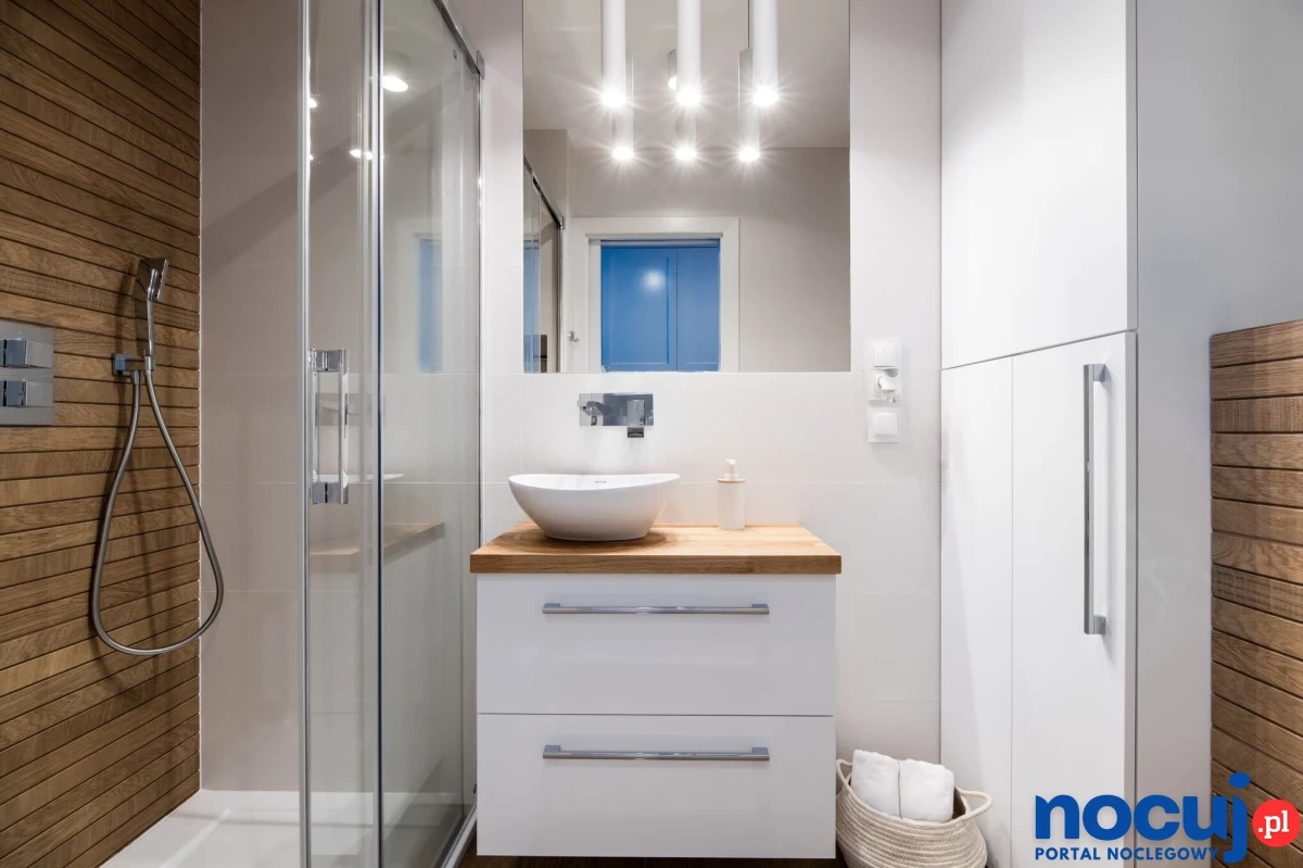 łazienka z toaletą (prysznic, ręczniki, suszarka do włosów, papier toaletowy „na start” , mydło)